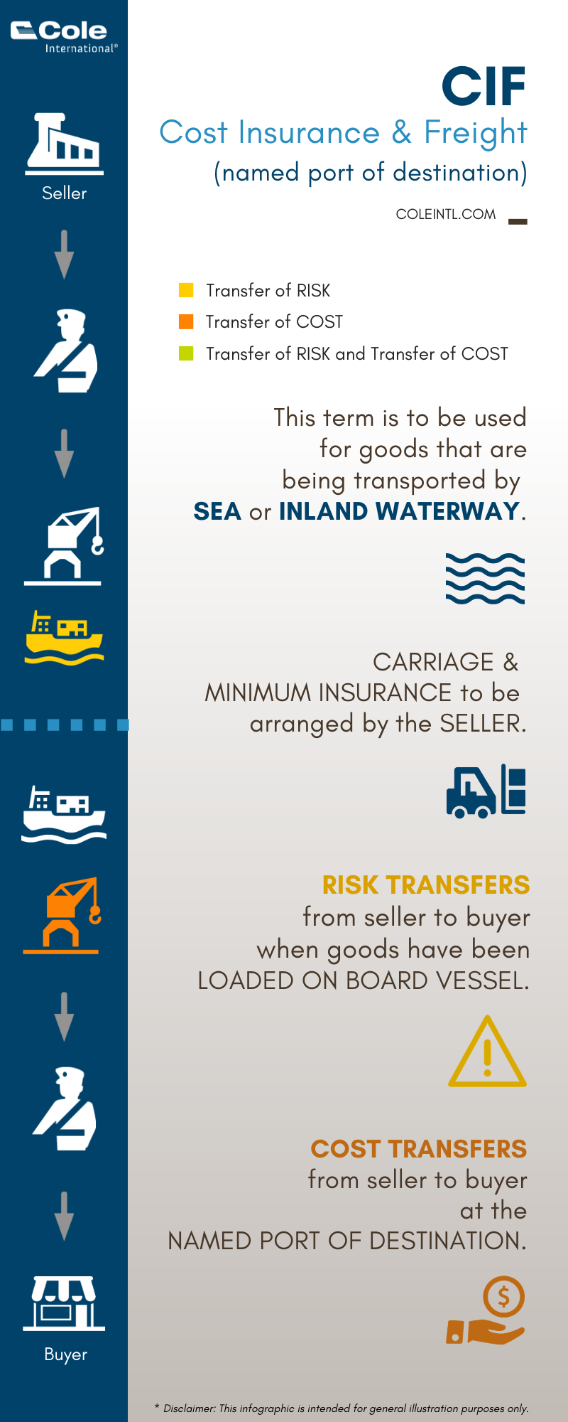 The following information is provided as a reference guide only, all parties should consult the official Guide to Incoterms published by the International Chamber of Commerce for a full description of their obligations, liabilities and risks associated with Incoterms.