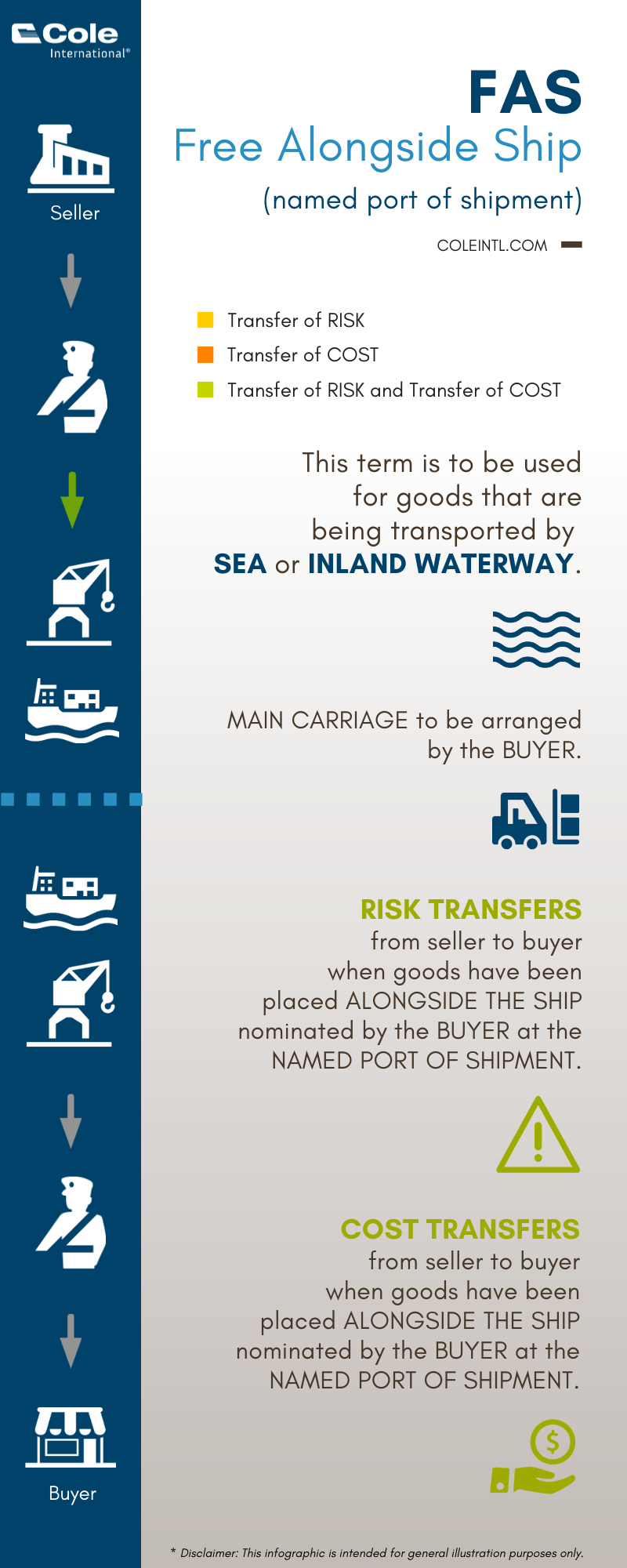 - FAS - Free Alongside Ship (named port of shipment)